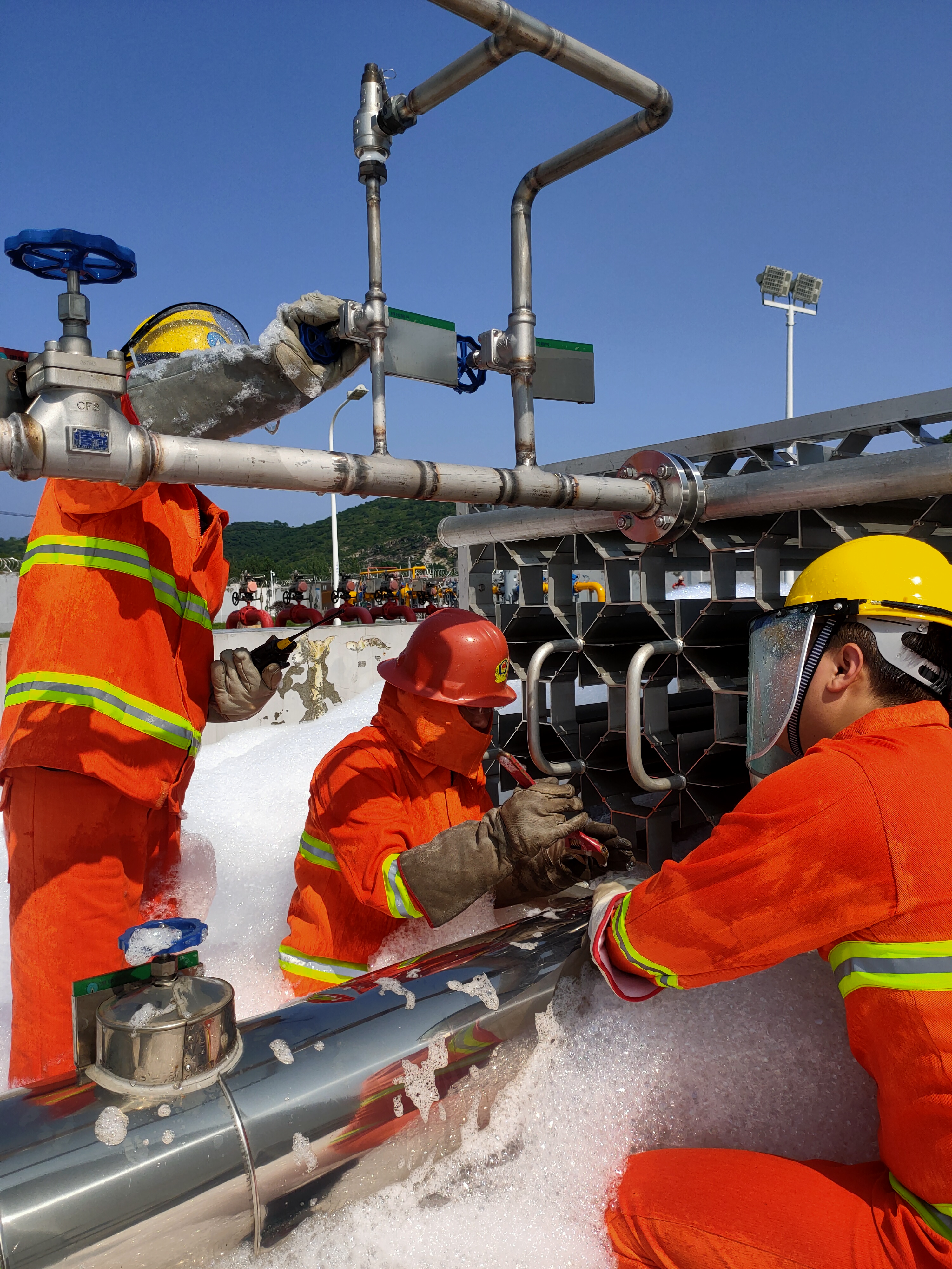 演練模擬了LNG站在氣化作業(yè)時出現(xiàn)儲罐增壓撬進液法蘭泄漏,罐區(qū)低溫探測器報警,聯(lián)動啟動泡沫發(fā)生器,泡沫迅速覆蓋泄漏區(qū)域。站控室值守人員迅速上報并立刻按下PLC的ESD緊急按鍵切斷所有氣動閥門,安保人員拉起警戒線負責警戒。在確認現(xiàn)場情況和泄漏位置后,搶險人員迅速穿戴搶險裝備前往泄漏點開展緊急搶險維修。演練歷時30分鐘,整個過程緊張有序、分工明確、處置得當。
