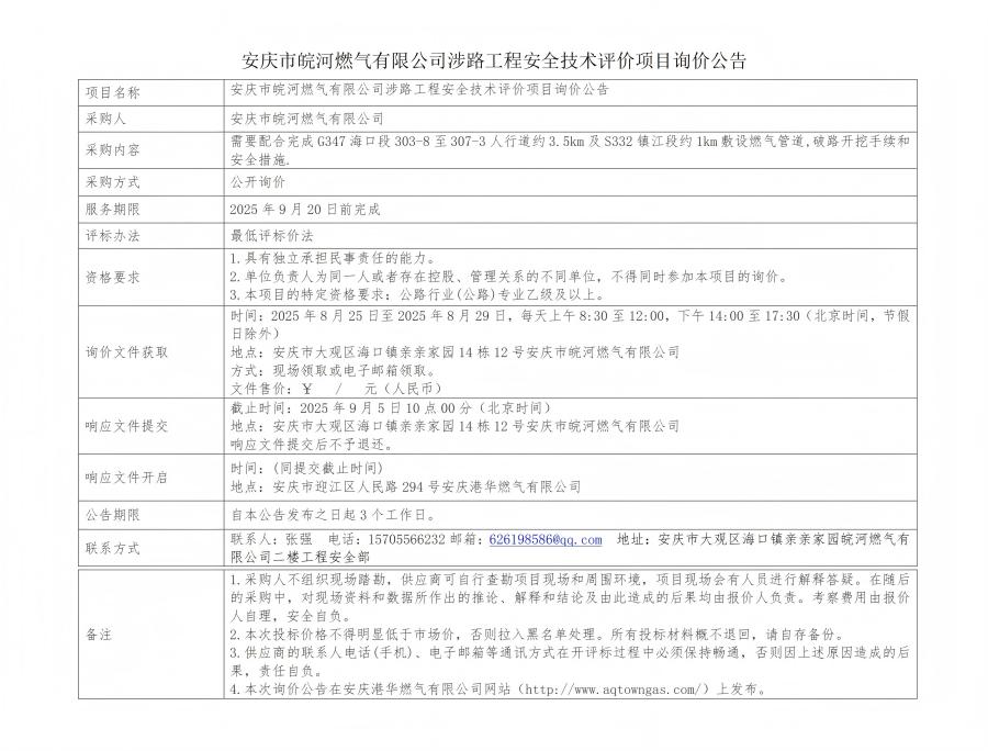安慶市皖河燃?xì)庥邢薰旧媛饭こ贪踩夹g(shù)評價項目詢價公告