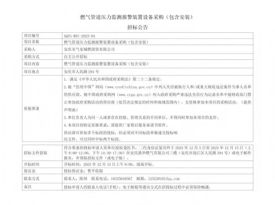 燃?xì)夤艿缐毫ΡO(jiān)測報警裝置設(shè)備采購(包含安裝)招標(biāo)公告